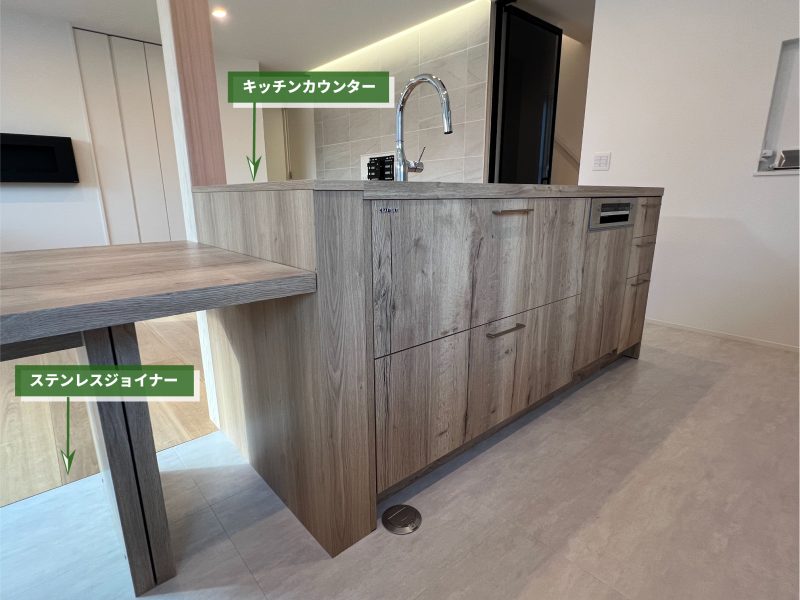 リビングとの見切り部分には厚さ3.6mmのステンレスフロアジョイナーを使用し、空間全体をスタイリッシュに仕上げました。キッチンとリビングがシームレスに繋がるデザインが、モダンな雰囲気を演出します。