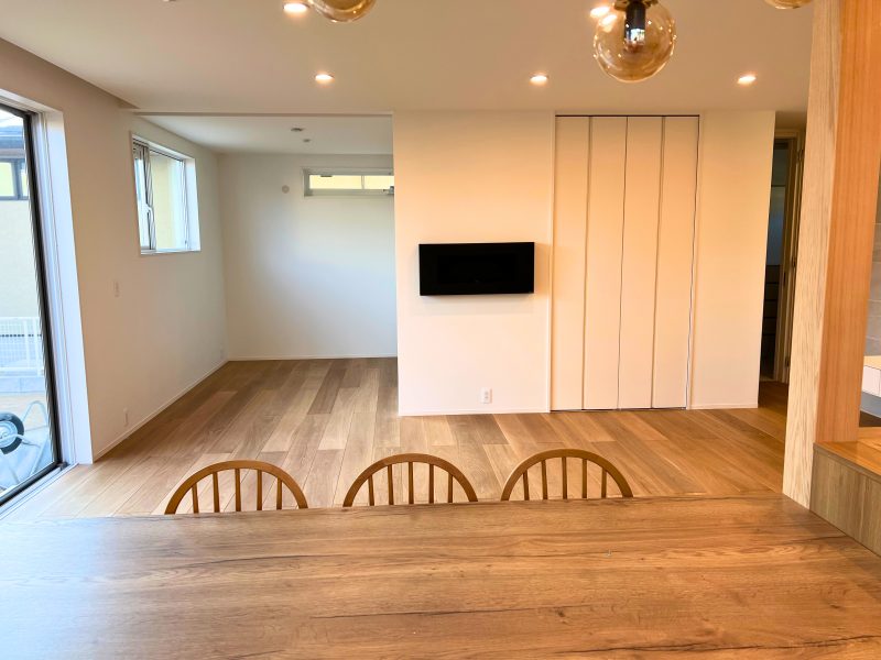 延床面積119.65㎡(36.2坪)の木造2階建ての長期優良認定住宅です。1階には広々とした23.5帖のLDKと、リビング横に4帖の洋室を配置。家族が自然と集まる快適な空間となっています。フローリングには、自然素材ならではの温かみと柔らかさを感じられる無垢材を使用しています。木目の美しさや経年変化による味わい深い風合いは、合板フローリングでは得られない特別な魅力です。