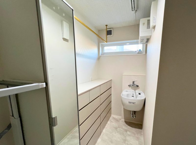 お子様がいる奥様からのリクエストで設置したスロップシンクは、日常生活の中で大いに役立つアイテムです。汚れた衣類や靴をリビングを通さずその場で手洗いできるだけでなく、掃除用具やペット用品の洗浄にも便利。家族の生活スタイルに合わせた機能的なランドリールームを実現しました。スロップシンクのある生活は、一度使えば手放せなくなる快適さです。洗剤などすぐに使えるアイテムを置くために、カウンターも造作しています。