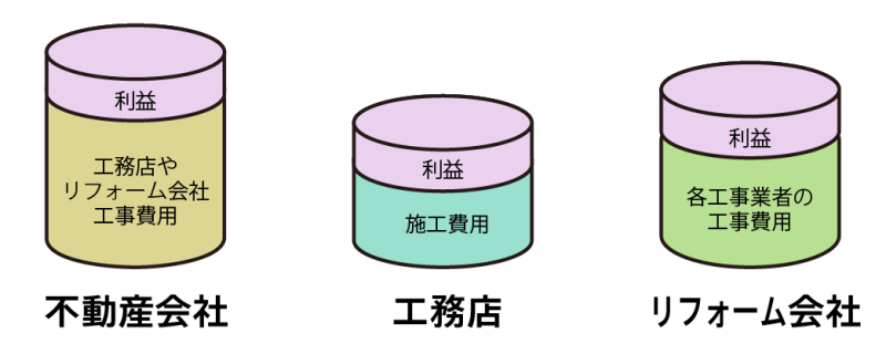 | マージンの仕組み | 売買・賃貸契約時の 仲介手数料や管理手数料を 収益とする 工事費用に利益を上乗せ | 施工費用に利益を上乗せ | 工事費用に利益を上乗せ (下請け業者を使う場合も) |