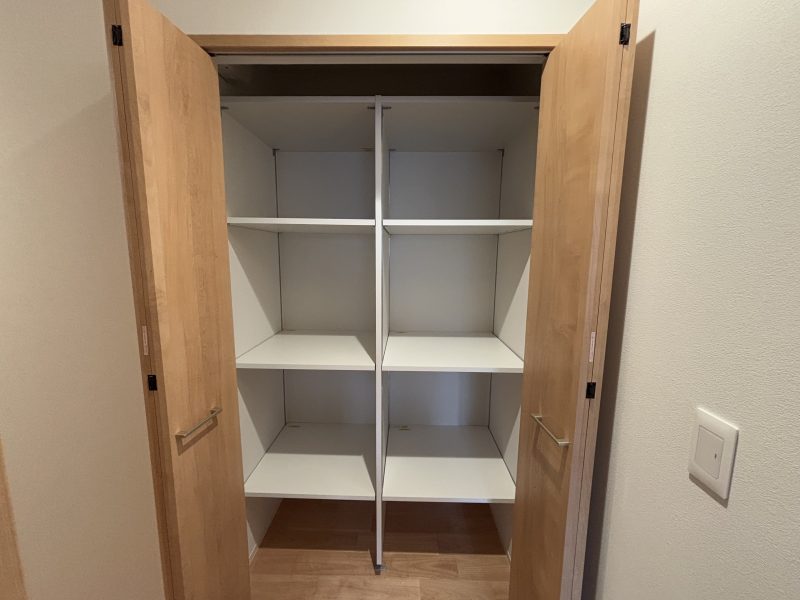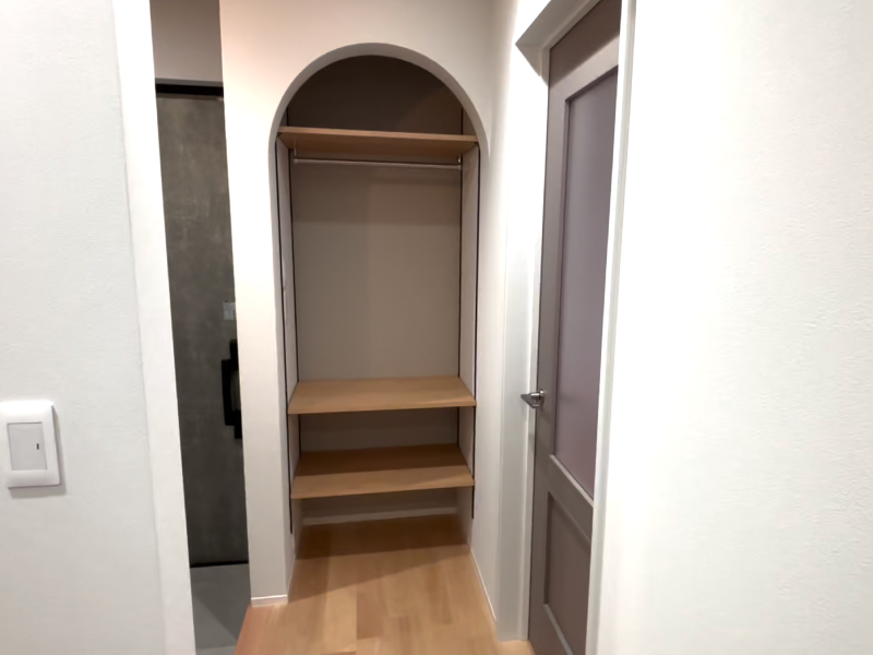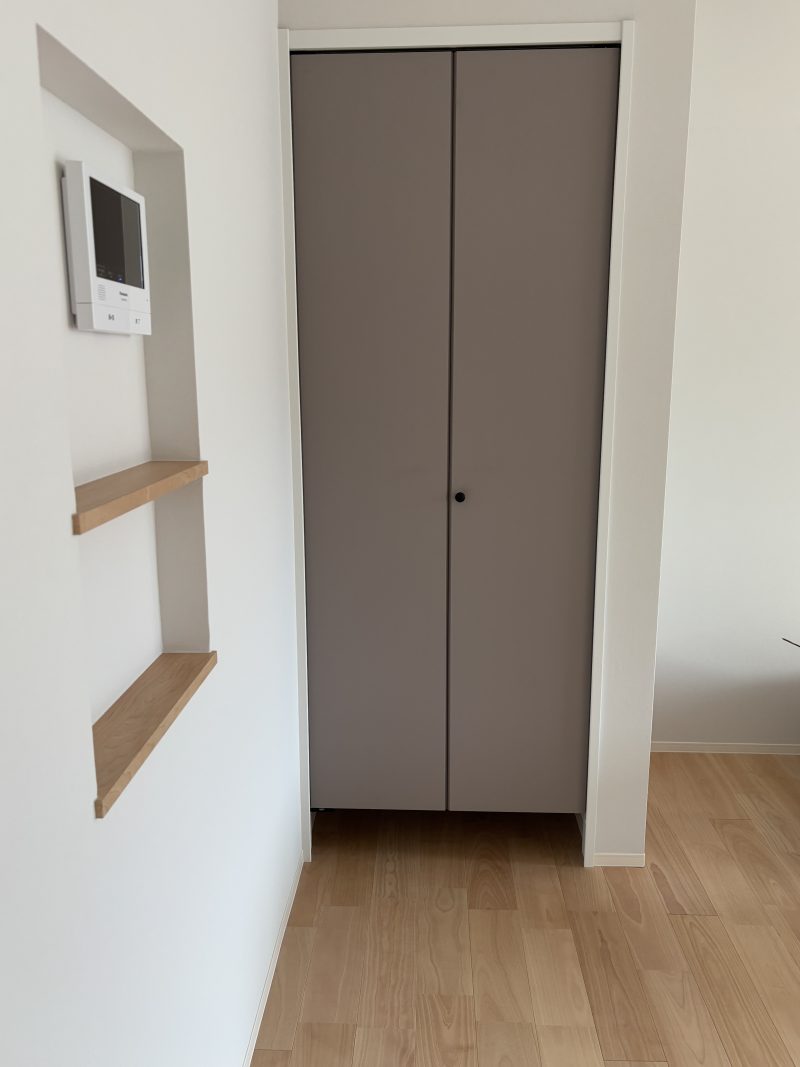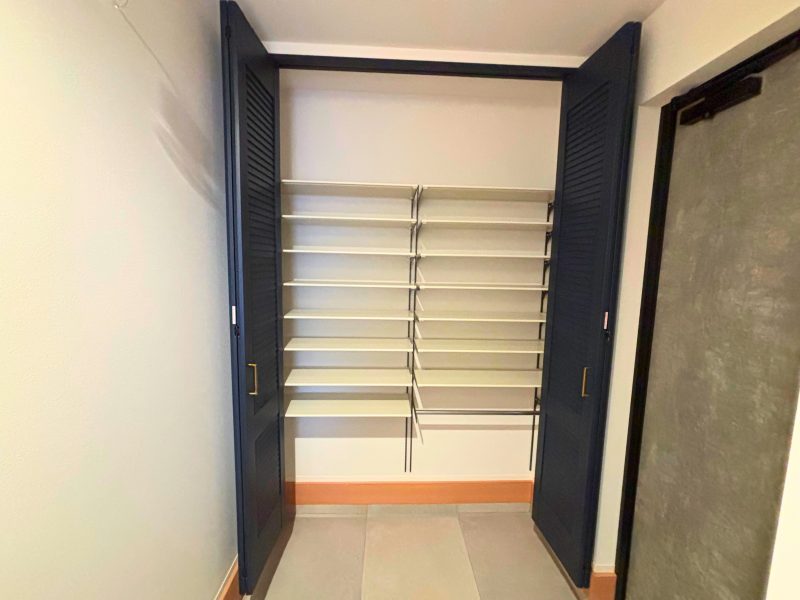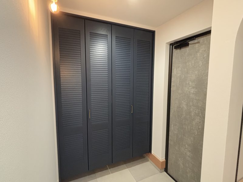 玄関をスッキリと広く使うため、シューズクロークは造作収納にしました。扉にはPanasonicのVERITISを採用し、ルーバー調のデザインが空間に上質な印象をプラス。家族全員の靴や傘などもたっぷり収納できるので、玄関はいつもスッキリと快適です。