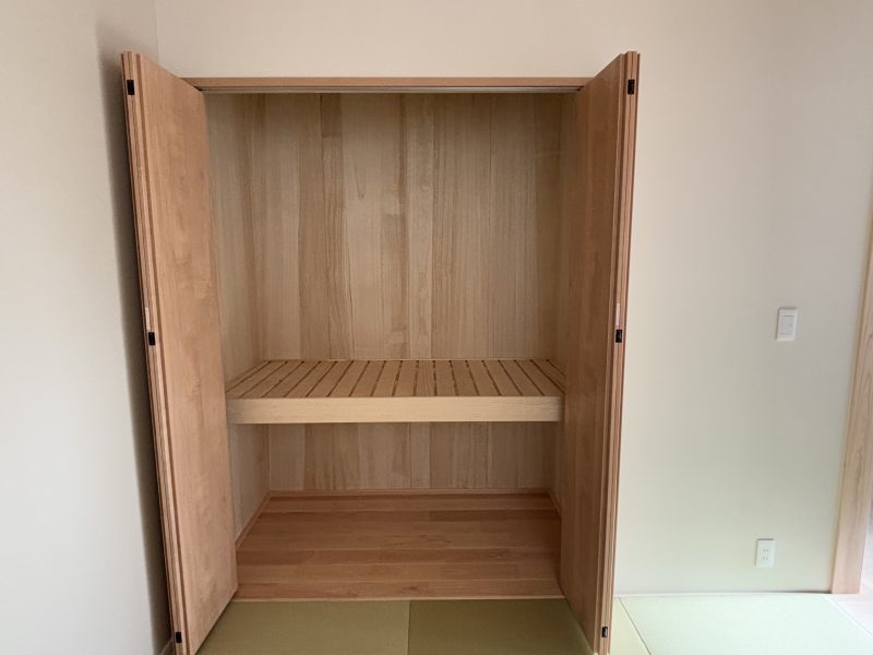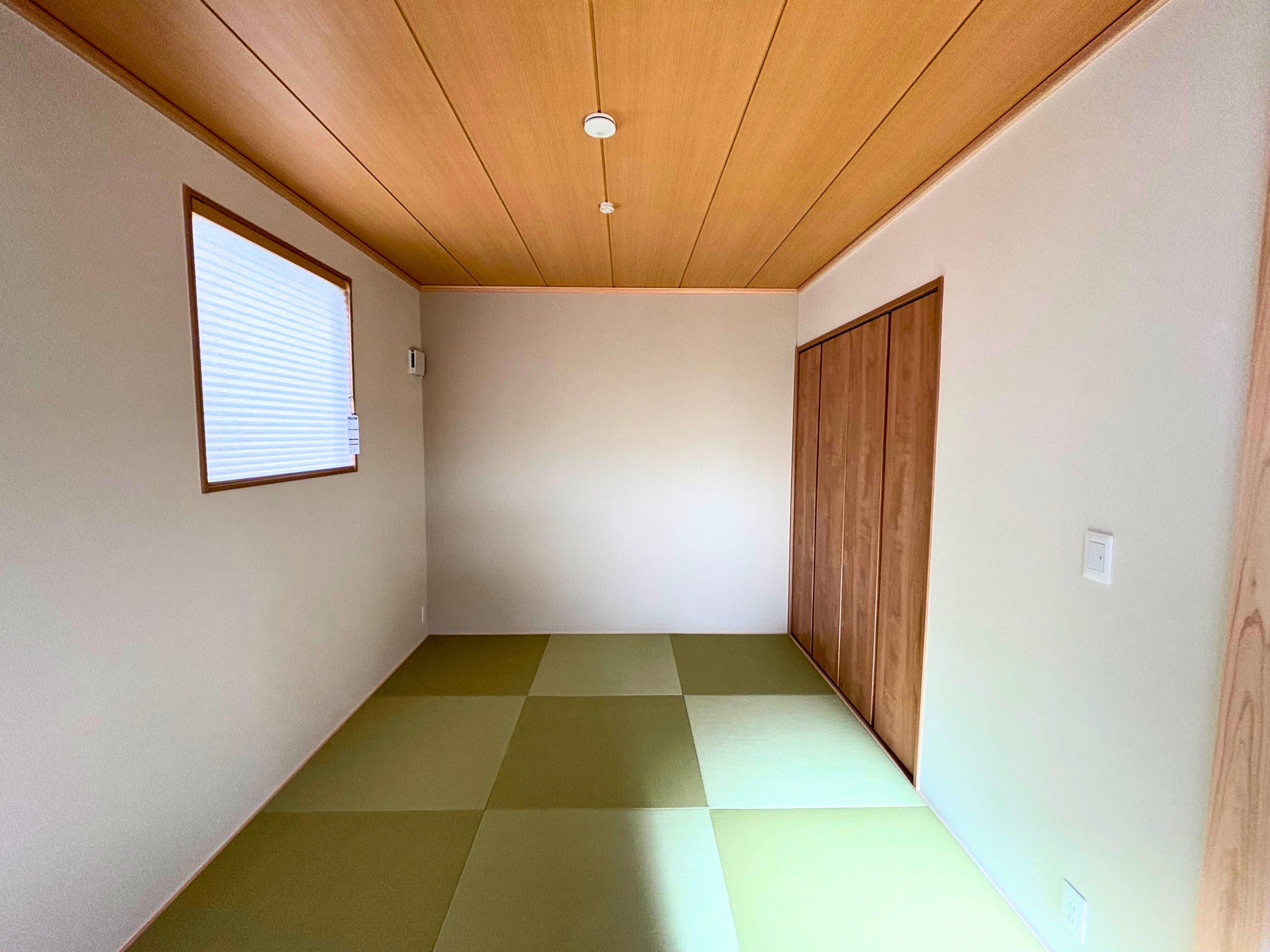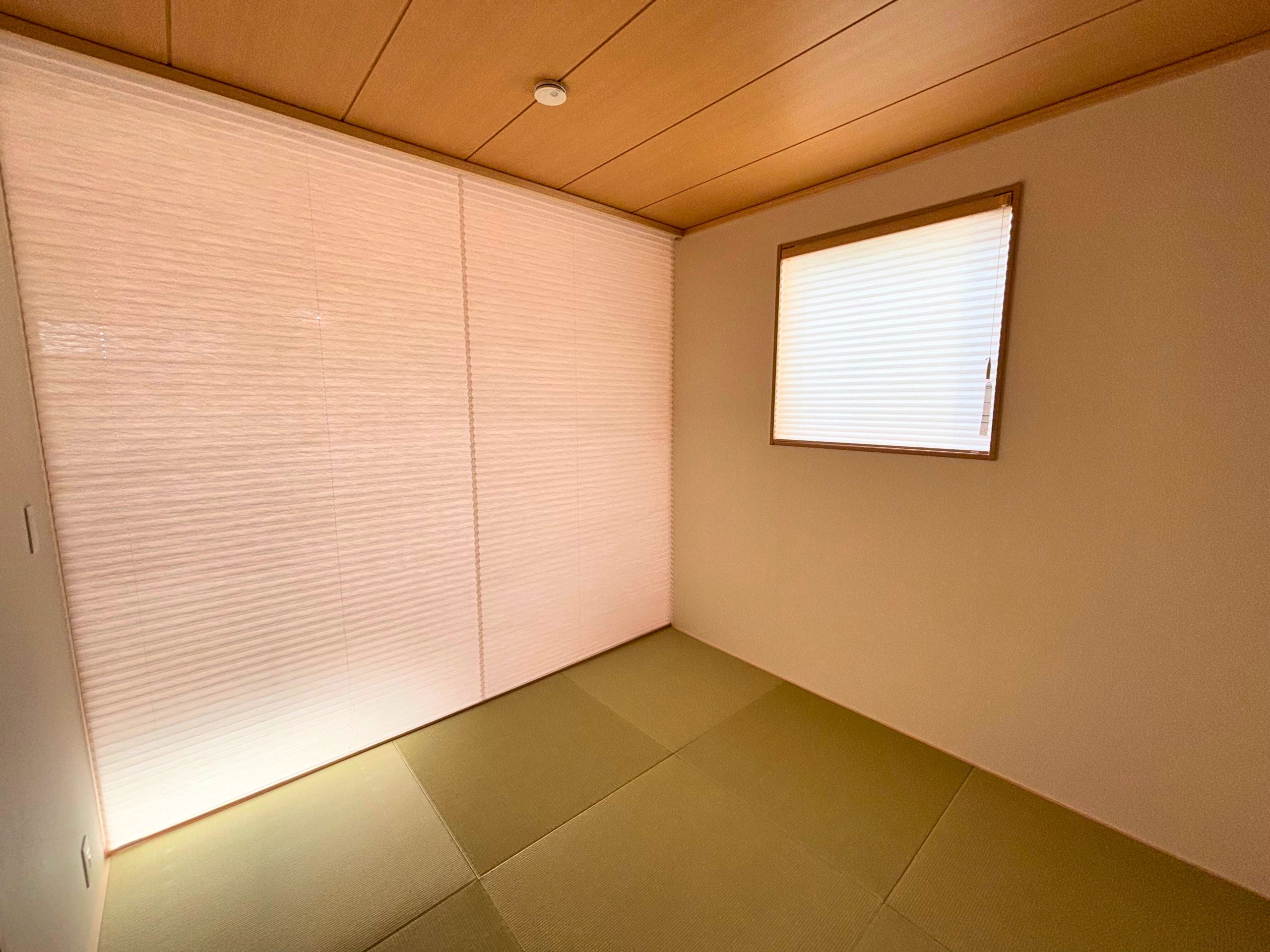 和室はリビングとつながりながらも、プライベート空間を守れるように工夫。ニチベイの電動プリーツスクリーンを採用し、必要に応じて開閉が可能です。普段は開けて開放的に、来客時や就寝時はスクリーンを下ろして落ち着いた空間を確保。リモコン操作で手軽に調整できるため、使い勝手も抜群です。