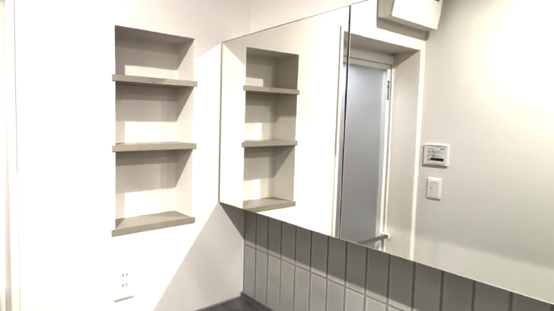 ここでは、三面鏡を開いた時に鏡が棚板に当たらないように、棚板は壁と面(つら)になるよう(壁から飛び出さないよう)に取り付けています。