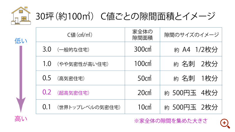 C値(相当隙間面積)とは、建物の延床面積1㎡あたりにどれだけの隙間があるかを示す数値です。