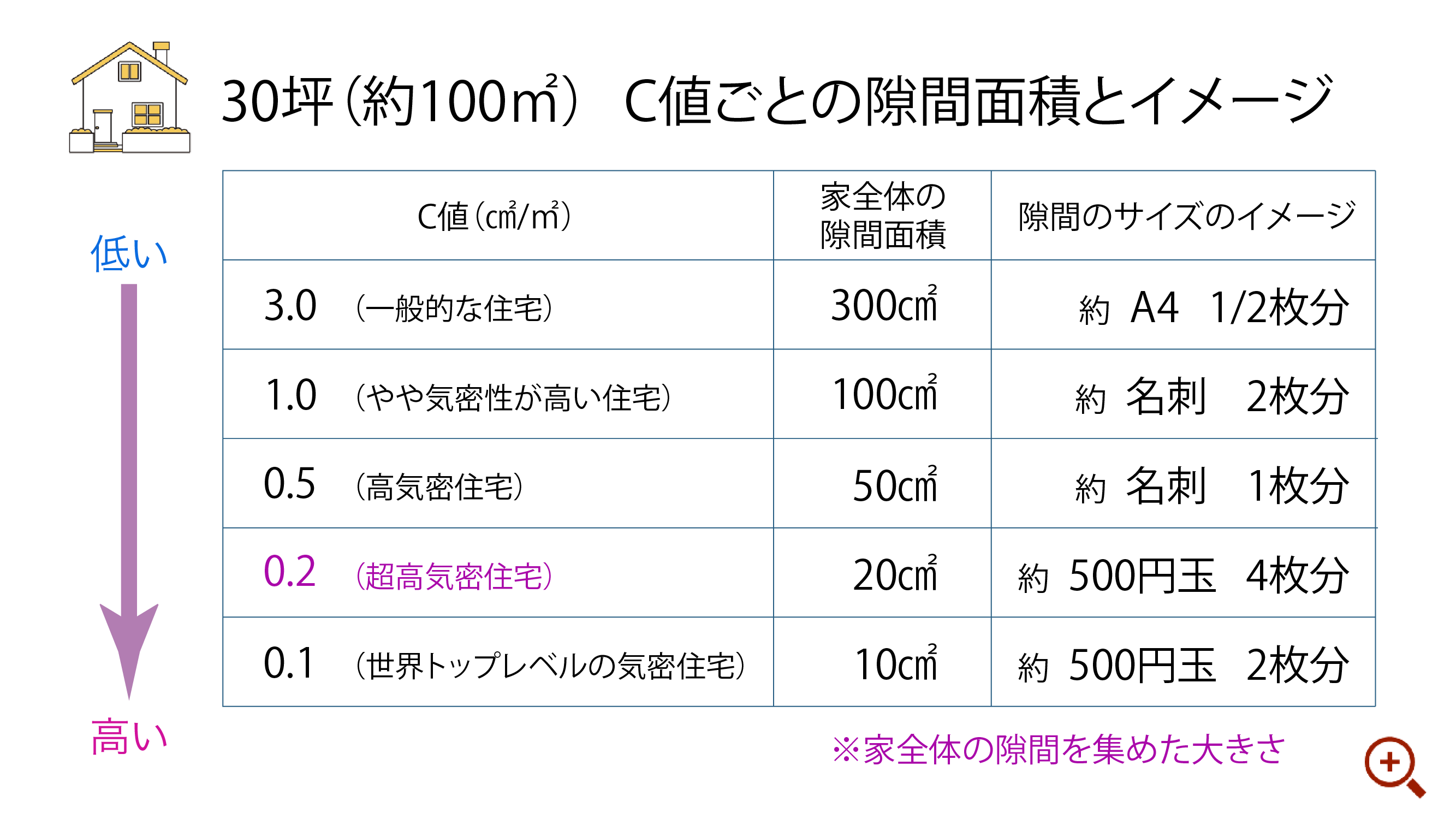 気密性能(C値)の違いによる比較表