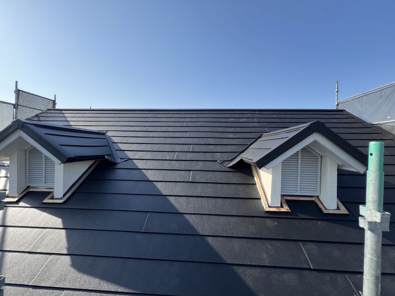 屋根の修繕にはカバー工法を採用し、軽量で耐久性の高いガルバニウム鋼板を使用しました。この工法は既存の屋根材を剥がさず、廃材を抑えながら断熱効果や防水性を向上させるメリットがあります。また、工期が短く、費用面でも経済的です。
